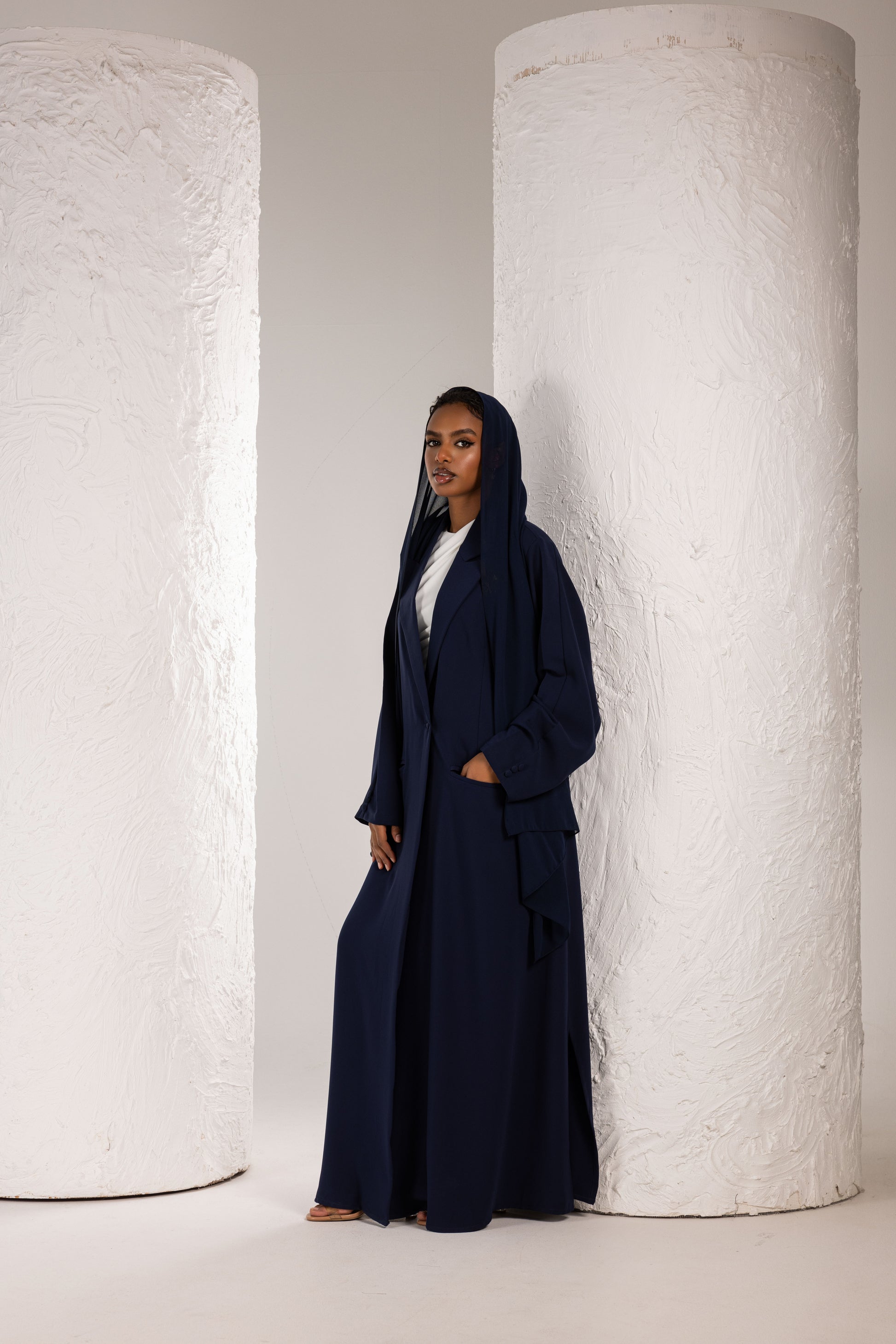 Effortlessly elegant and endlessly versatile. This contemporary abaya features a tailored blazer-inspired cut with structured shoulders and a flowing silhouette that drapes beautifully. The open front design layers perfectly over casual or dressed-up looks, while the wide sleeves add a relaxed, modern feel.